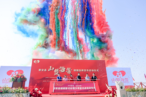 副局长陈海鹏、惠安县政府副县长陈剑虹出席活动,并与出席活动的嘉宾共同推杆启动县民政局婚姻登记处西沙湾户外颁证点和“山盟海誓·爱在惠安”婚姻登记服务品牌,同时为20对新人颁发了结婚证。