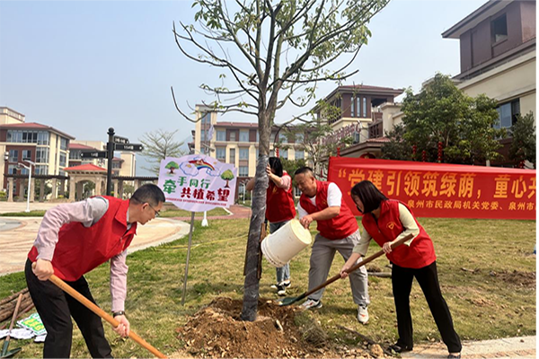 植树实践环节,来自三个党组织的30余名党员与市社会福利中心的孩子们分工协作,挥锹铲土、扶苗培土、浇水固根,一株株树苗在大家齐心协力下,稳稳扎根于大院,为这里的生活环境带来新的生机,现场气氛热烈而温馨。