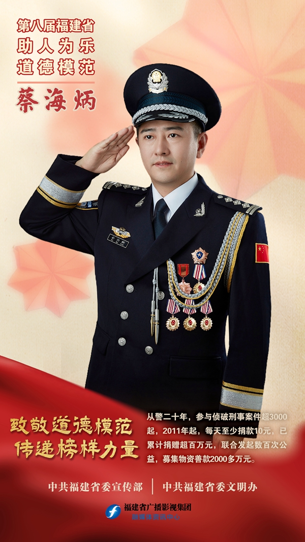 蔡海炳,第八届福建省道德模范,石狮市公安局锦尚派出所所长,一级警长。